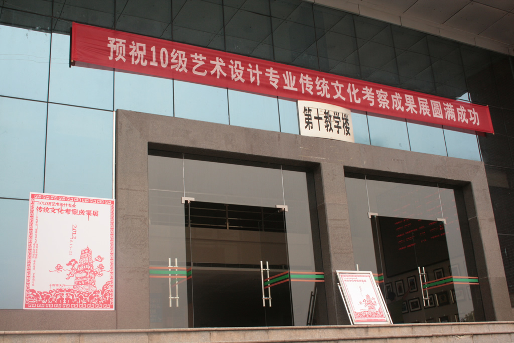 我校艺术设计专业10级传统文化实践考察成果展示 2012年10月15日,我校10级艺术设计专业的传统文化实践考察成果展在10教学楼南楼大厅如期举行。本次展览是针对本学期为期2周的陕西传统文化实践考察而进行的一次成果展示。展出了包括摄影作品、建筑速写、民间剪纸、工艺美术等一系列内容。