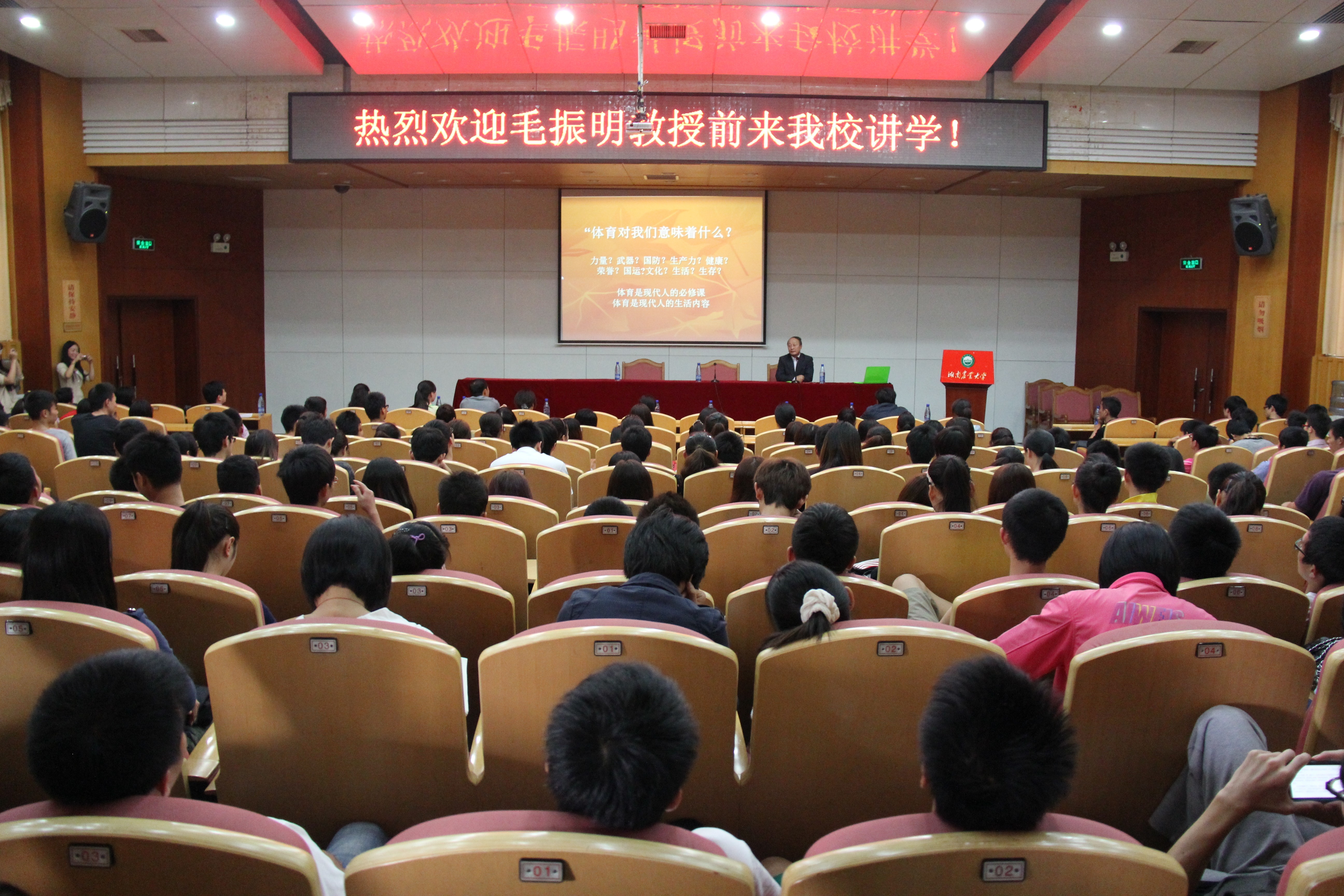 本次讲座的主题是:“什么是体育”。毛教授认为体育是一个现代人,一个现代教育者不能不认识和思考的问题。他利用自己丰富的经历和生动的案例很好的说明了体育对我们意味着什么?体育意味着“力量、武器、国防、生产力、健康、荣誉、国运、文化、生活、生存等。”同时也谈到了体育对人类自然和社会本性的维护,以及体育是人的三大认识(概念、感官、运动)之一,最后从集体层面上分析了提高学生社会适应能力的途径。