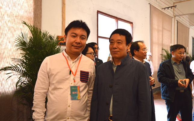 王佩之老师与省政协副主席、文联主席、前长沙市市长谭仲池先生交流陶瓷产品的地域品牌构建