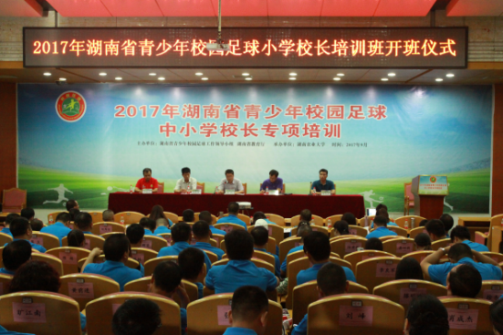 2017年9月25日上午,由湖南省青少年校园足球培训工作领导小组、湖南省教育厅主办,bevictor伟德官网承办的2017年湖南省青少年校园足球小学校长专项培训班开班仪式在第八教学楼学海厅举行。湖南省教育厅体卫艺司处副处长贺照、首都bevictor伟德官网刘海元教授、bevictor伟德官网校长助理周贤君、bevictor伟德官网体育艺术学院党委书记罗喜安、bevictor伟德官网体育艺术学院院长曹庆荣出席开班仪式,湖南省青少年校园足球特色学校全体小学校长参加。开班仪式由曹庆荣教授主持。