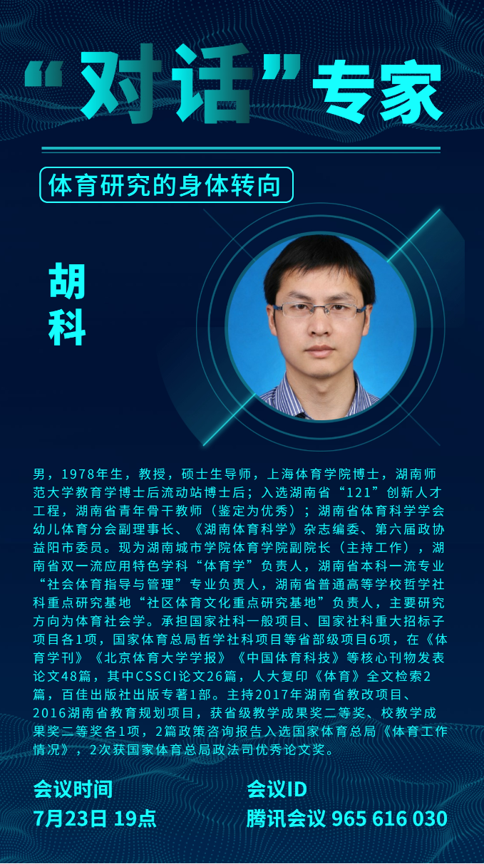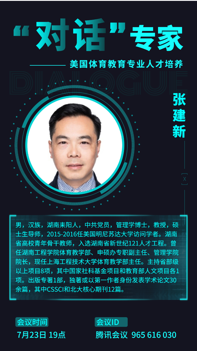 7月23日晚7点,由bevictor伟德官网举办的体育学硕士研究生线上专题讲座在腾讯会议正式拉开帷幕。本次活动邀请到了上海工程技术大学体育教学部主任张建新教授,湖南城市学院bevictor伟德官网院长(主持工作)胡科教授进行讲座。本次讲座由bevictor伟德官网副院长刘周敏博士主持,全院所有研究生认真聆听了两位专家的精彩讲授。