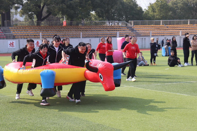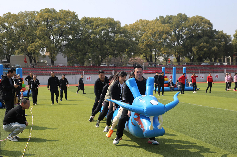 这个游戏考验的是团队的默契,全组奋力前行带着自己的“坐骑”协同队友一起冲向终点。