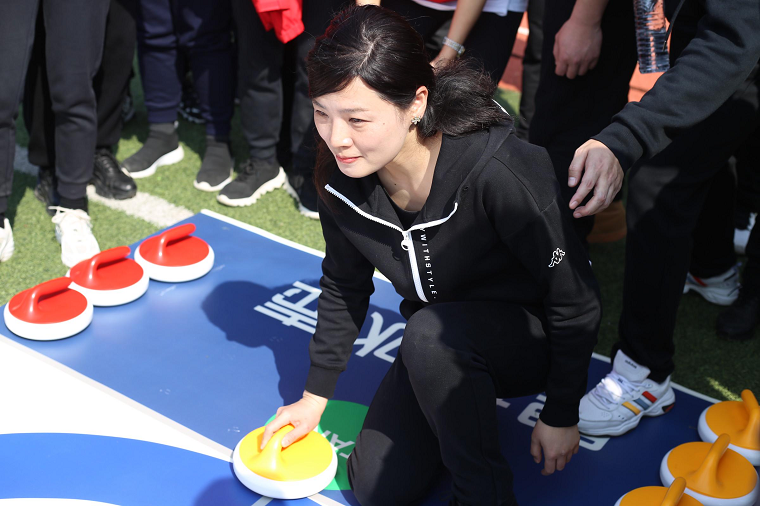 奋力一推,不同颜色的冰壶沿着滑道,滑向最远的地方。