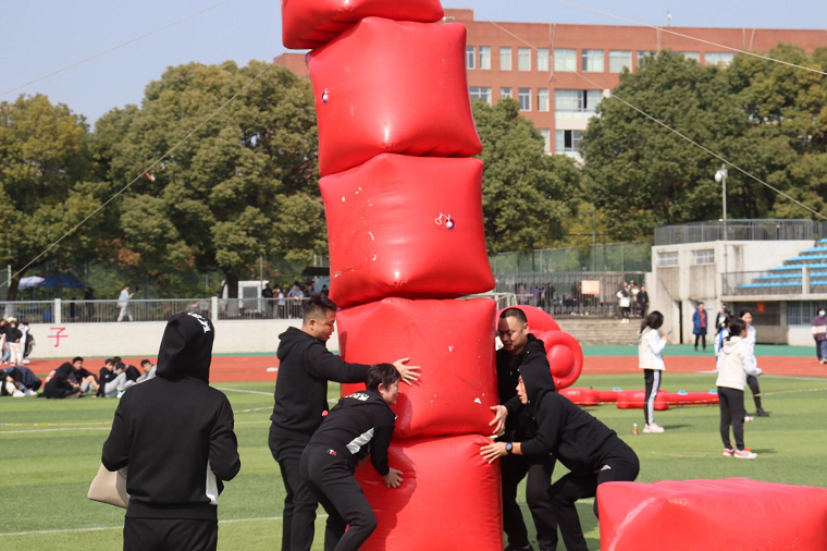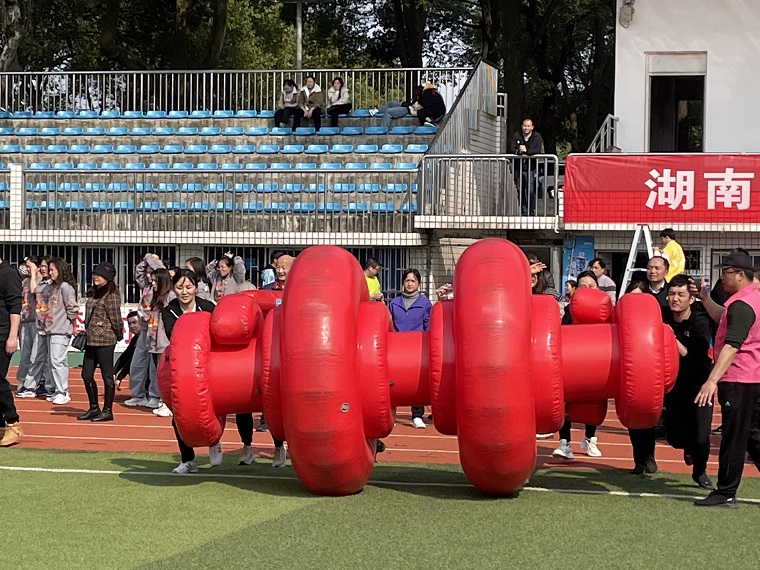 各队队员争分夺秒地将气圈运向柱子,运动员们争先恐后地奔跑,展现着他们矫健的身姿。