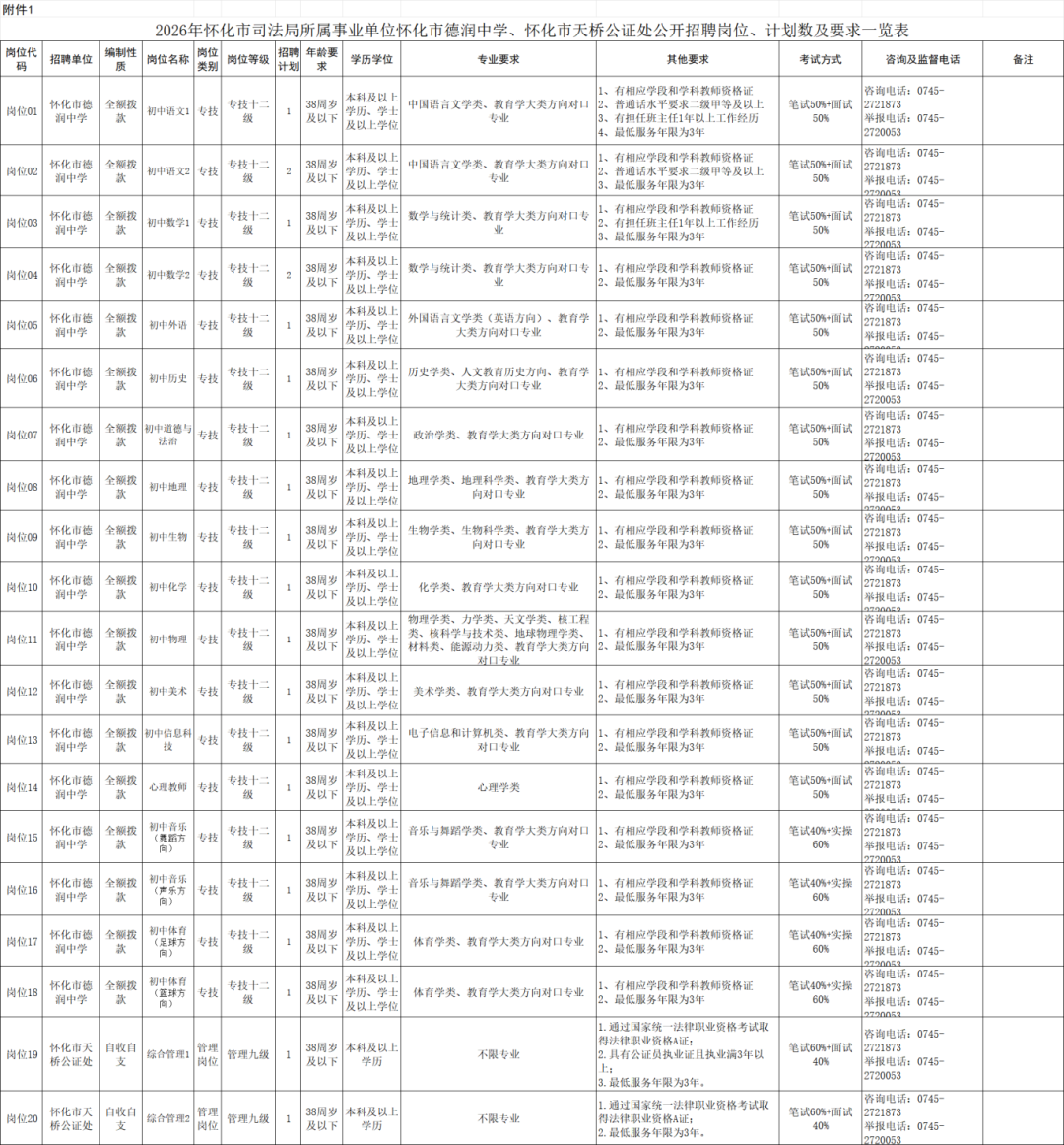 1.2026年怀化市司法局所属事业单位怀化市德润中学、怀化市天桥公证处公开招聘岗位、计划数及要求一览表
